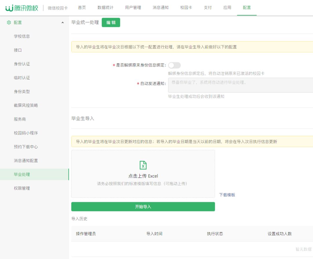 导入毕业生表格,包括学工号、毕业日期、身份类型等信息。当然毕业生表格模版可以在后台中下载。
