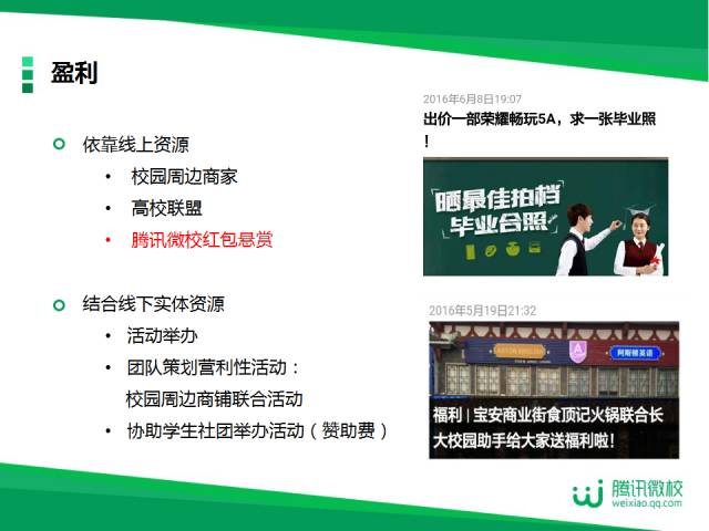 4.盈利:分为线上与线下资源,微校红包悬赏为公众号提供线上资源,完成任务即可领取赏金;